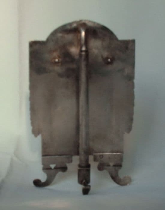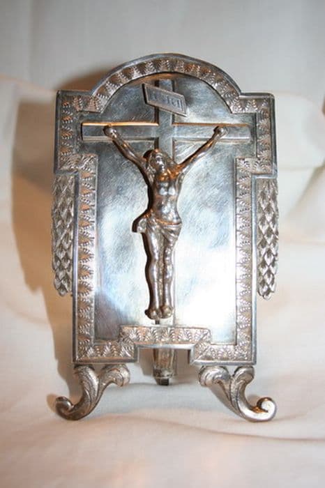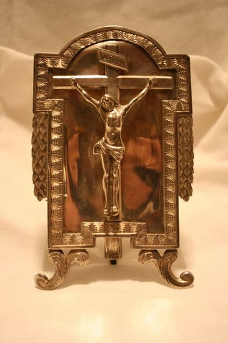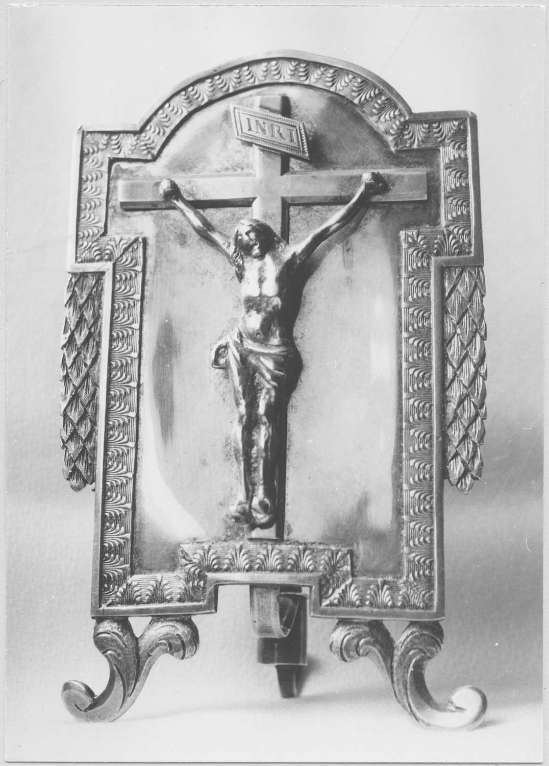 Le Christ en croix est en relief, les deux pieds cloués. Le cadre est supporté par trois patins, ceux de devant étant de forme végétale.