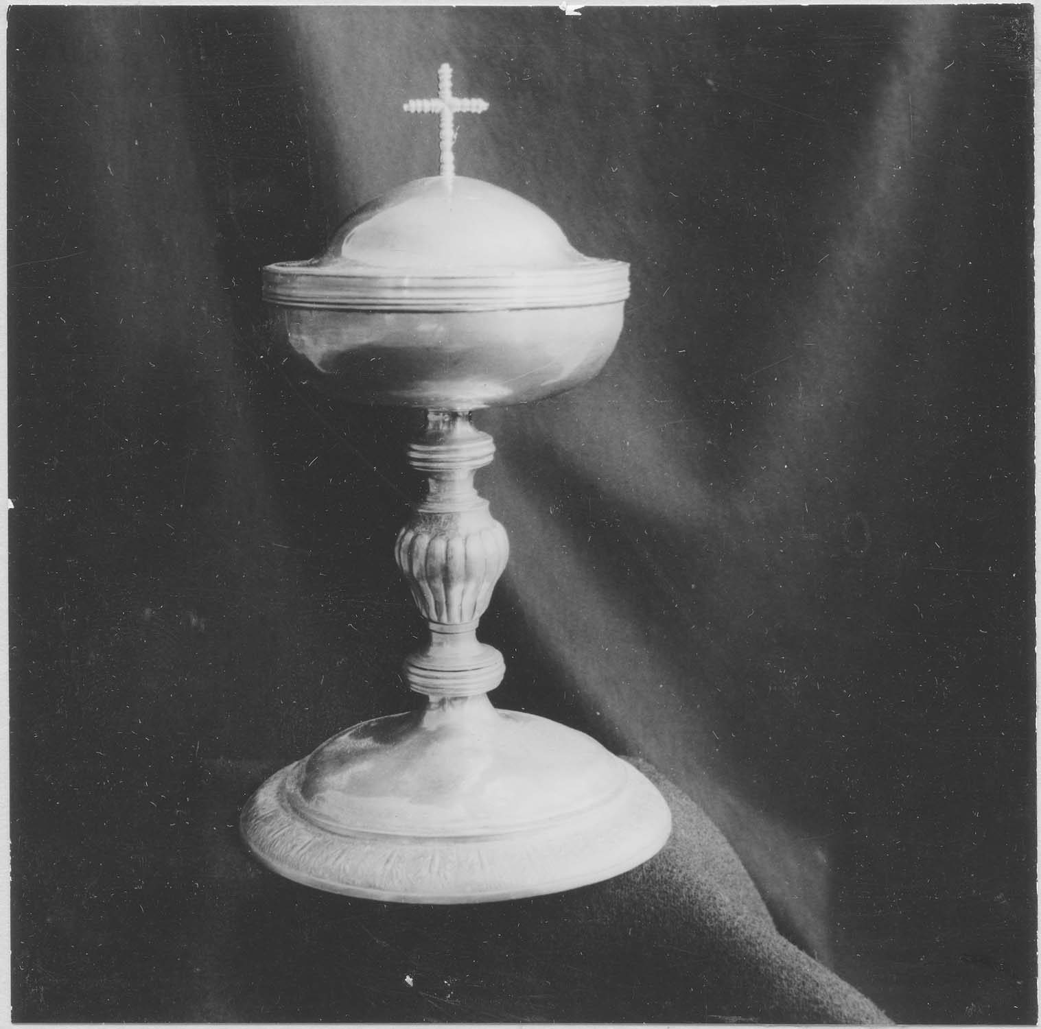 Le noeud est godronné. Le couvercle présente une croix latine, faite de patits éléments en chapelet.