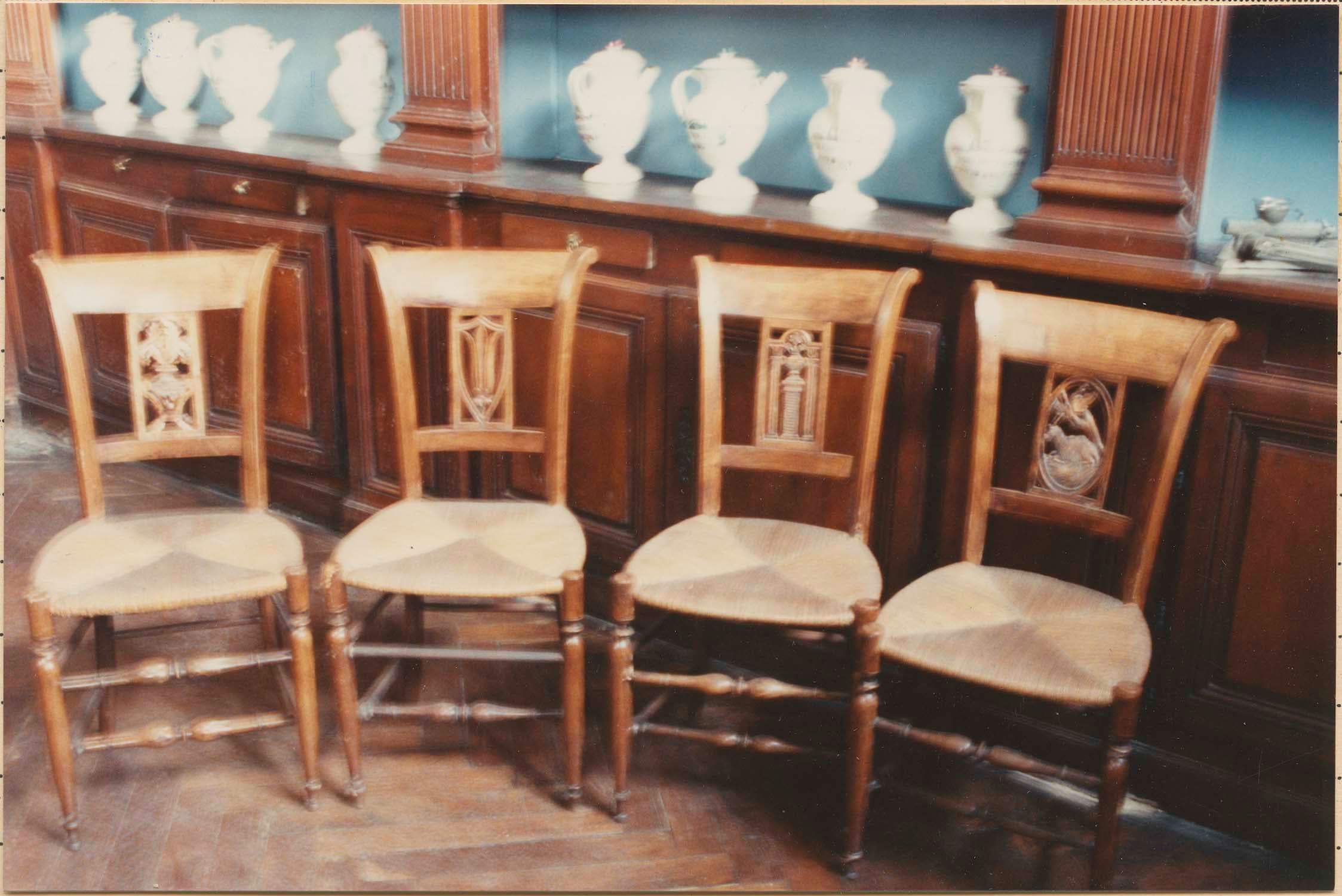 Ces chaises présentent un dossier sculpté et ajouré. Les sièges sont en paille.