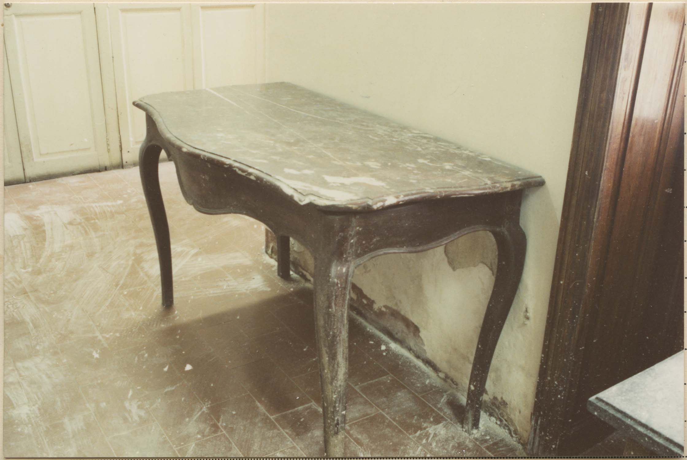 Les traverses ont un profil galbé et découpé. Le marbre couvre cette table en suivant les contours de la façade, et est droit à l'arrière.