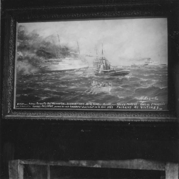 Inscription : offert par André ROUQUETTE, chef mécanicien, en reconnaissance à Notre-Dame des Auzils pour l'avoir protégé lors de l'incendie qui détruisit le 'Georges Philippar' en vue du cap de Guardafui dans la nuit du 16 mai 1932, faisant 41 victimes.