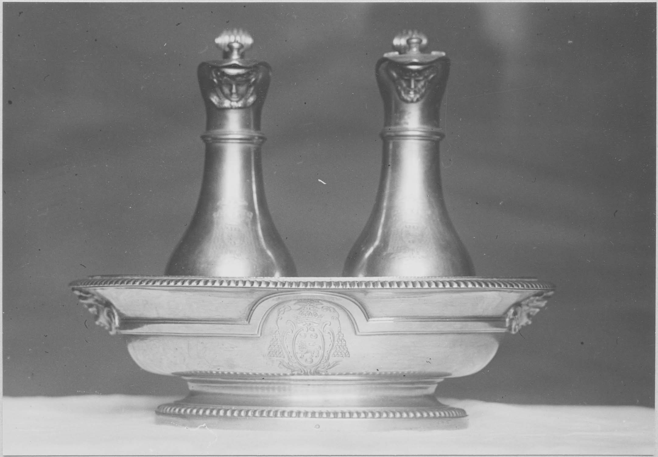 Armoiries : armes d'Arthur-Richard de Dillon, dernier archevêque de Narbonne. Inscription : lettre A (sur l'une des burettes). Inscription : lettre V (sur l'autre burette).