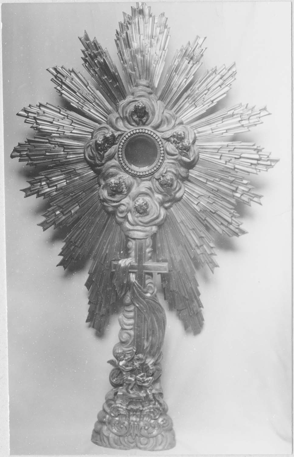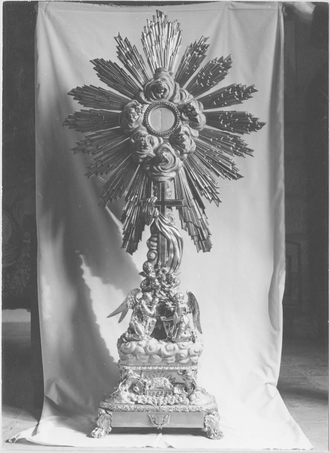 La base rectangulaire, en cuivre doré, est posée sur quatre patins en griffes de lion. Le fût s'emboîte sur deux tenons. L'évidement central du soleil, où est la lunule, est entouré de 44 petits cristaux de roche taillés.