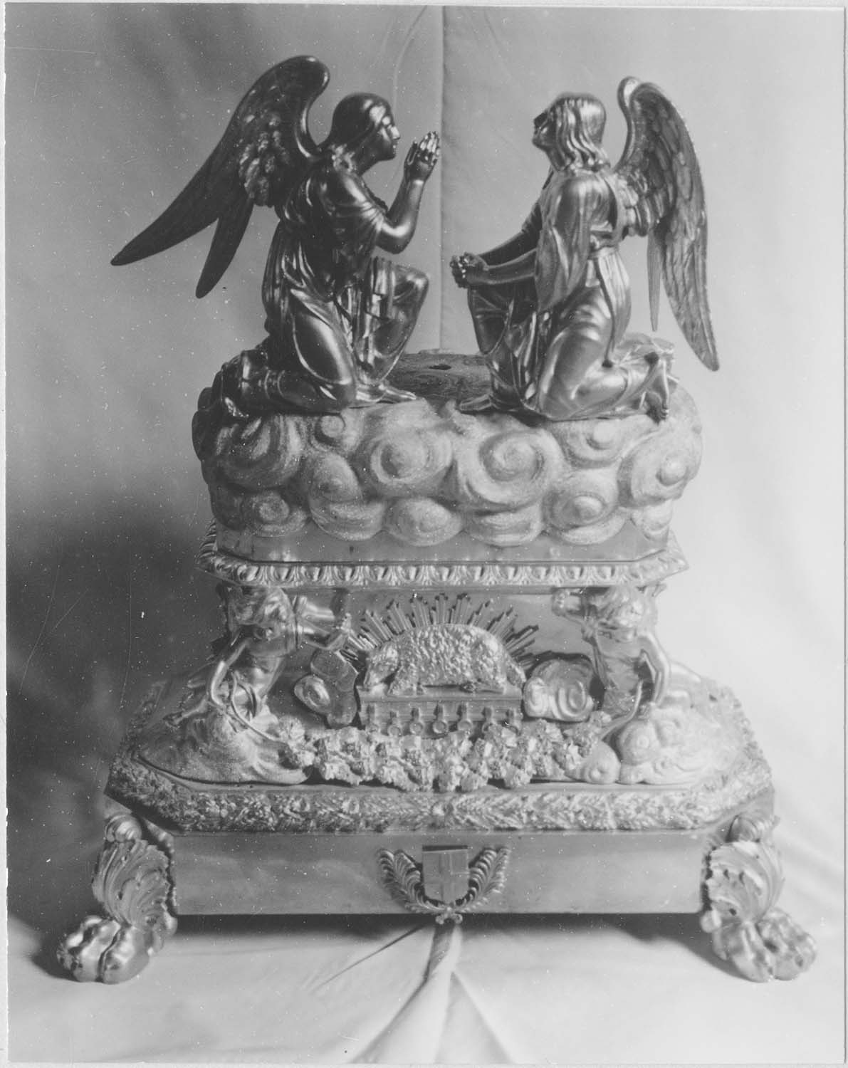 Armoiries : écusson du chapitre entouré des palmes du martyre de saint Just et de saint Pasteur. Poinçon de maître : J.A. BASNIER dans un losange. Poinçon : Minerve.