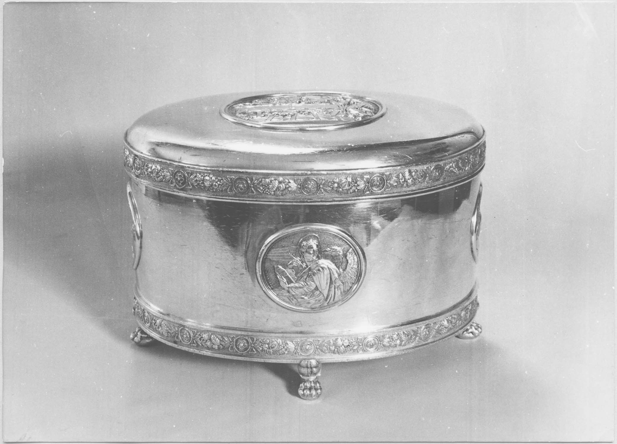 Cette boîte ovale est posée sur quatre patins en forme de griffes de lion. Elle est fermée par un couvercle monté sur une charnière à fiche. Les flancs sont ornés de médaillons ovales ciselés.