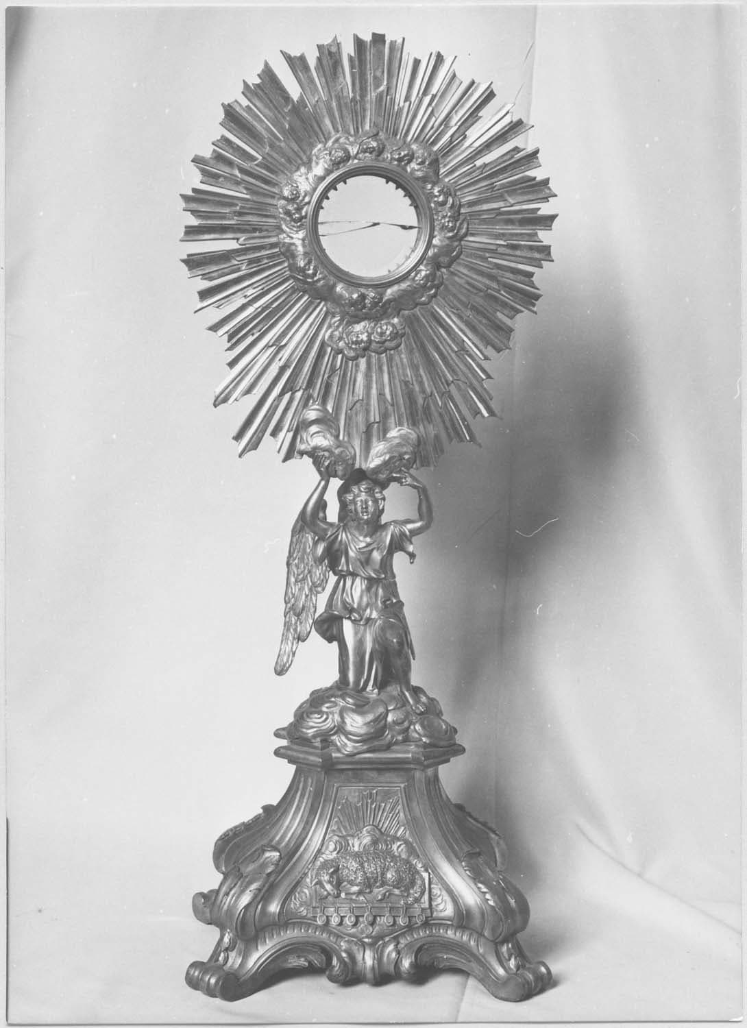 Sur une terrasse rectangulaire, un ange tient le soleil aux rayons inégaux.