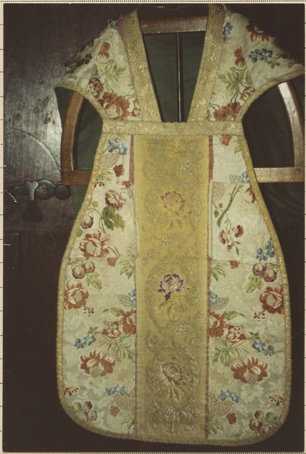 Chasuble en soie à fond blanc du 18e siècle, avec des bandes de brocart du 19e siècle.