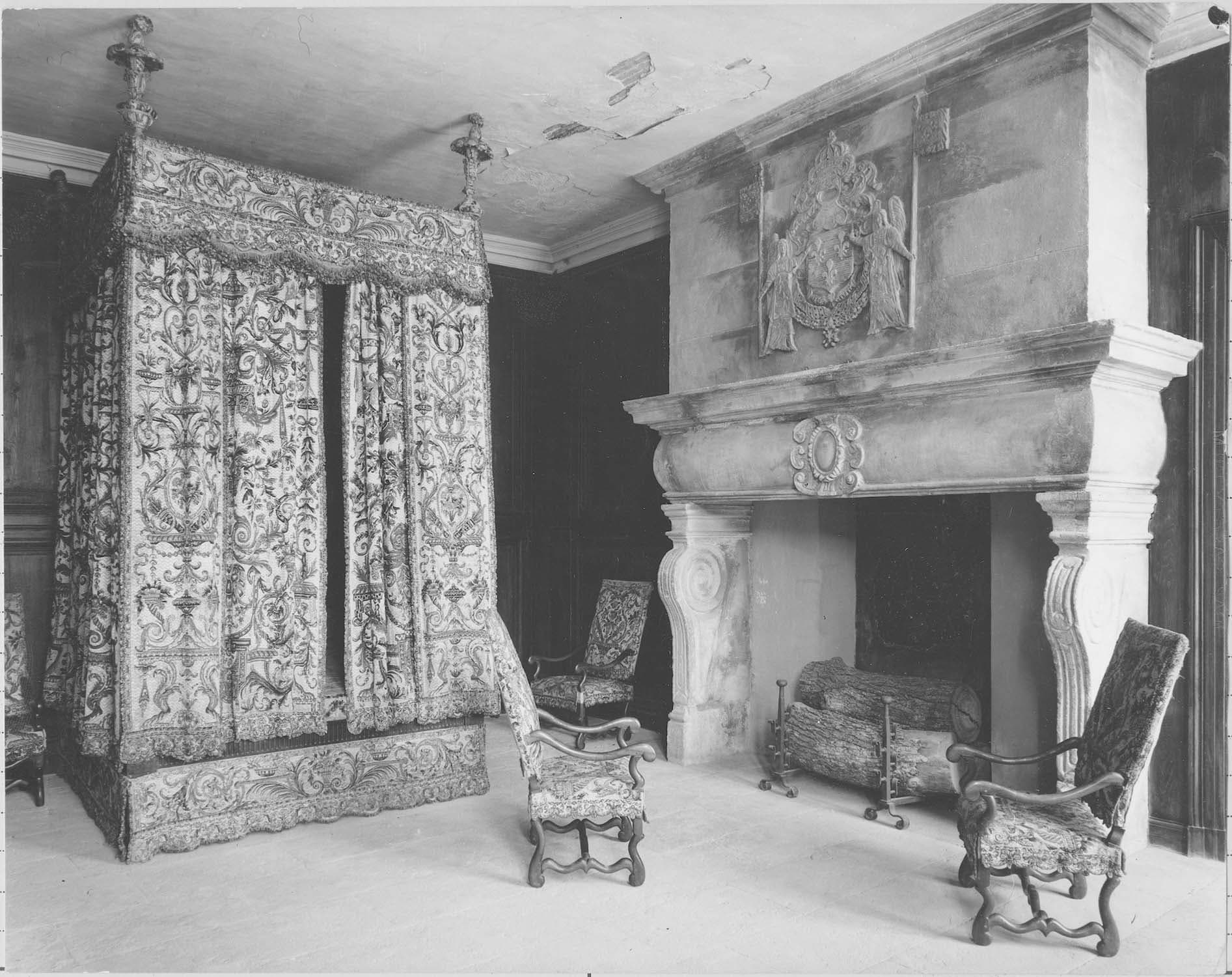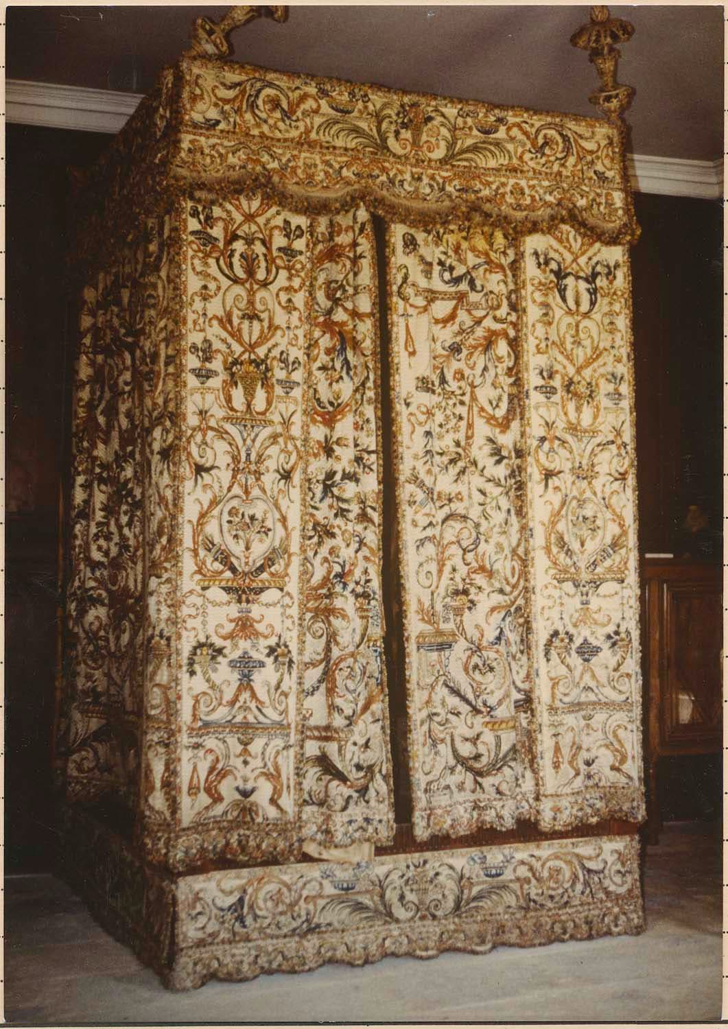 Lit à quatre colonnes avec un dais surmonté de plumets, entouré de pentes assorties à celles du soubassement et des rideaux de tapisserie. Les tapisseries sont garnies de soie. Le panneau du chevet est assorti à l'ensemble.