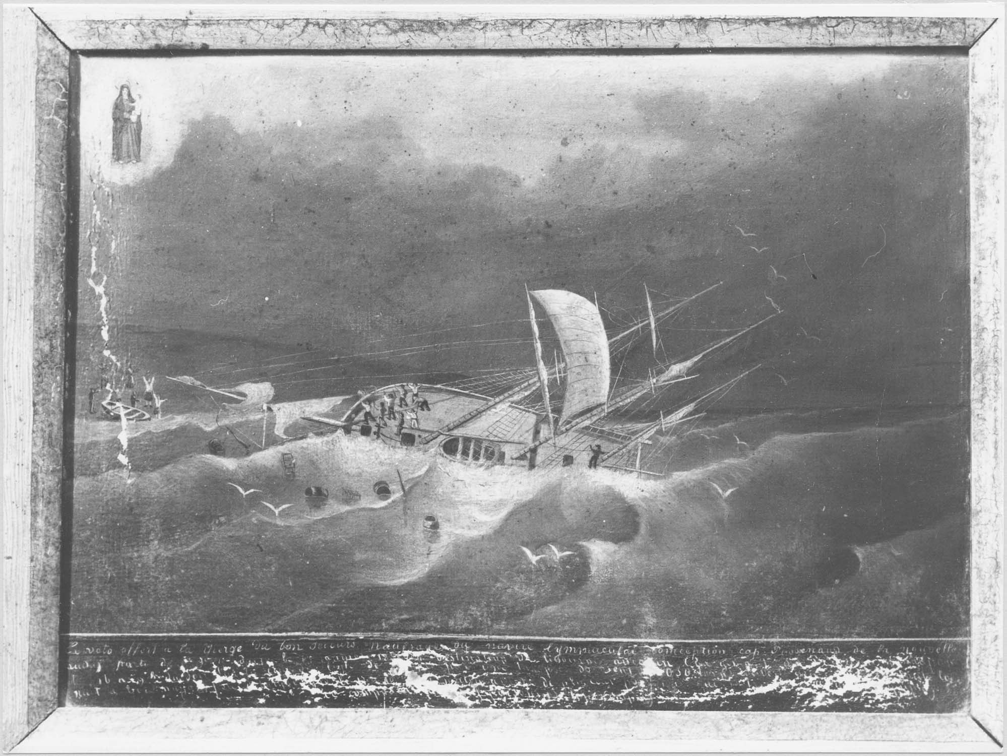 Inscription (partiellement illisible) : Ex-voto à la Vierge du Bon Secours, naufrage du navire l'Ymmaculée Conception ; cap. Passenaud de La Nouvelle (Aude) parti de [...] le 15 août 1858, à destination de Livourne avec un chargement [...] à 9h. Du soir sur la côte de [...] de [...] une tempête de vent [...] O.S.O. [...] la nuit à bord n'ayant peu [...] d [...] baty [...] le de plusieurs [...] (au bas de la toile).