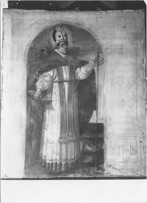 Dans un encadrement d'architecture traité en grisaille, Saint Nicolas est représenté en évêque, avec, en bas à droite la représentation de son atribut de protecteur de navires. Le vêtement est d'une grande sobriété, mais l'aube est toutefois décorée de dentelle; la mitre est plus précieuse. Dans la main droite, un livre, la main gauche tient une crosse.