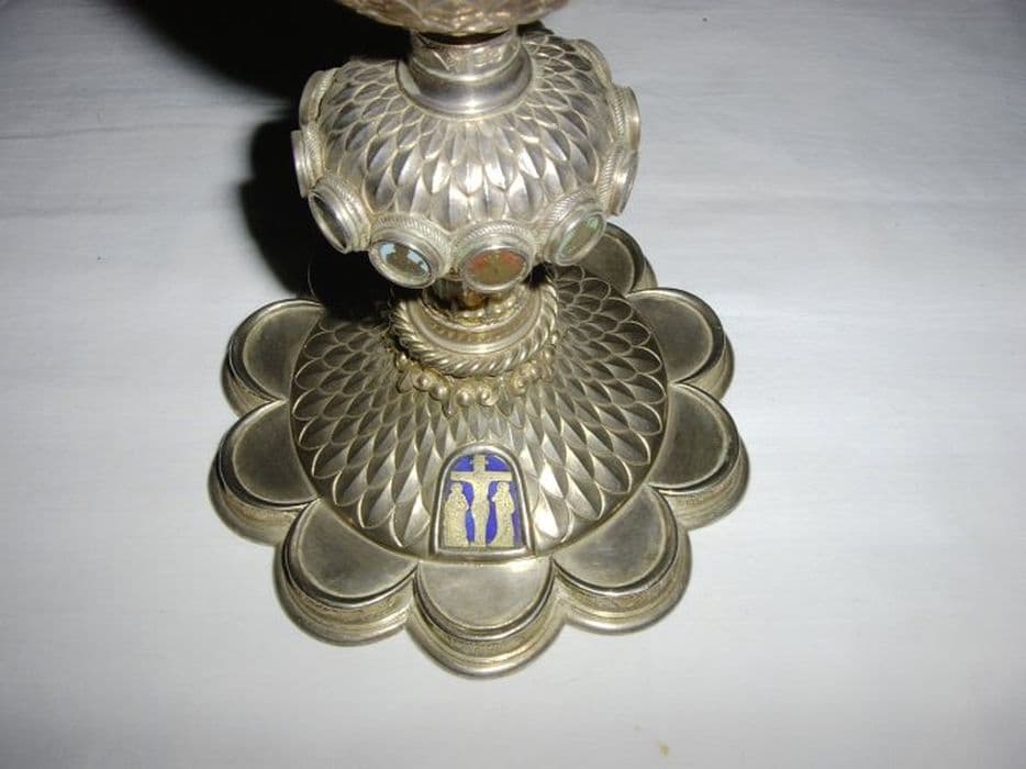 Bord du pied à bandeau encavet entre deux tores et contours polylobés. Dans le cavet décor incisé de petites fleurs. Le dessus du pied est décoré de 6 rangs en dégradé de feuilles d'eau lisses disposées en écailles de poisson et se terminant au bas de la tige par une frise d'arabesques sous un anneau en forme de cordon tressé et surmonté d'une couronne de fleurs de lys. Sur ce décor de feuilles d'eau, se détache une plaque émaillée bleu ciel représentant la Crucifixion, Saint Jean et la Vierge Marie au pied de la croix. Le nud large est aplati est décoré de deux rangées opposées de feuilles d'eau lisses . Douze boutons émaillées représentent les douze apôtres. Une gorge moulurée décorée, comme la tranche du pied de petites fleurs, assure la transition avec la coupe évasée. La fausse coupe est ornée d'un culot de feuilles d'eau lisses comme sur le reste de ce vase (7 rangs). Sur ce culot, les rangs de feuilles les plus petites se trouvent à la base de la coupe et deviennent progressivement plus grandes plus on s'approche de la lèvre du calice.