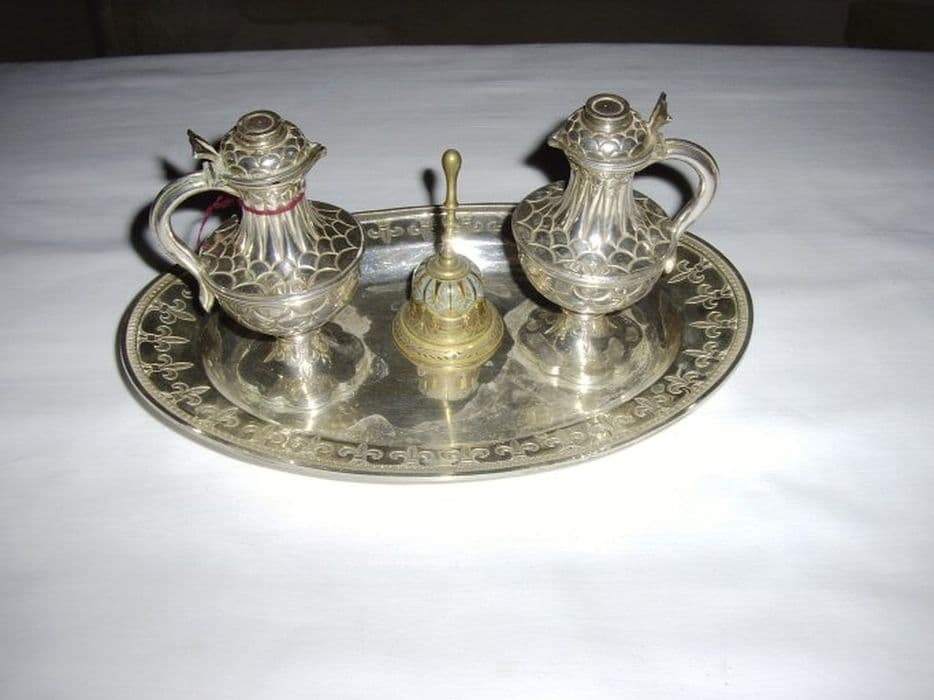 calice ; patène ; burettes ; plateau à burettes ; clochette d'autel