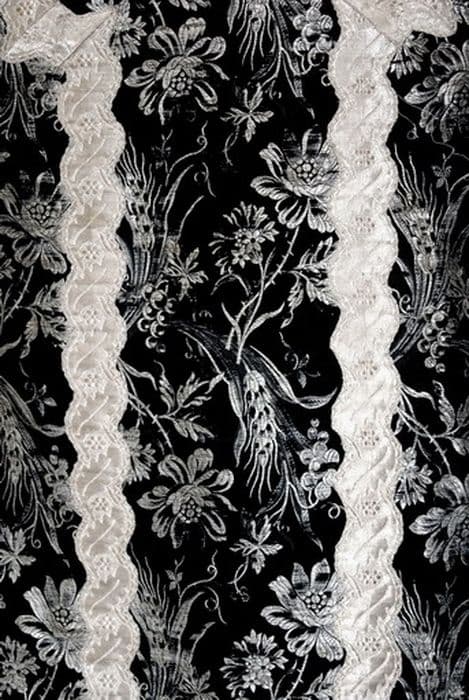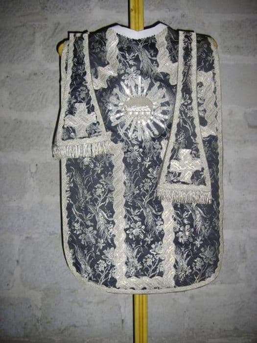 Chasuble en soie noire brochée de fils d'argent montrant des rinceaux végétaux composées de fleurs, dépis mais aussi de grappes de raisins. Cest un tissu religieux. Au XIXe siècle, on a rajouté au centre de la croix dorsale un agneau du sacrifice couché sur le livre des sept sceaux,