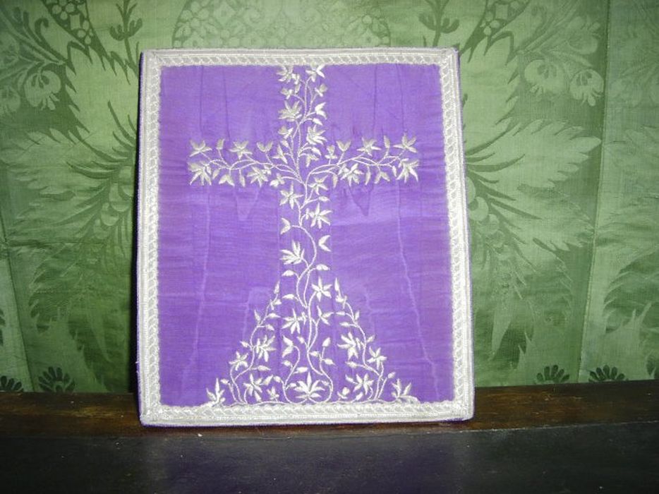 Moire brodée de chaque côté d'une croix ; fils d'argent.