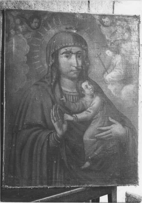 La Vierge Marie est représentée à mi-corps, tenant l'Enfant Jésus sur son bras gauche, elle est vêtue d'une robe aux plis verticaux et d'un manteau. un voile brodé de perles est posé sur sa tête et retombe sur ses épaules. Sa tête est auréolée d'un cercle d'où irradient des rais alternativement droits et ondulés. L'Enfant Jésus saisit de sa main gauche le pouce de la main droite de la Vierge. Il a l'air apeuré par l'ange , qui au dessus de lui, présente une croix. Dans les coins supérieurs, des angelots dans une nuée encadrent le groupe. Une sorte de hiératisme byzantin émane de cette toile.