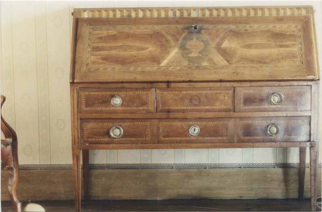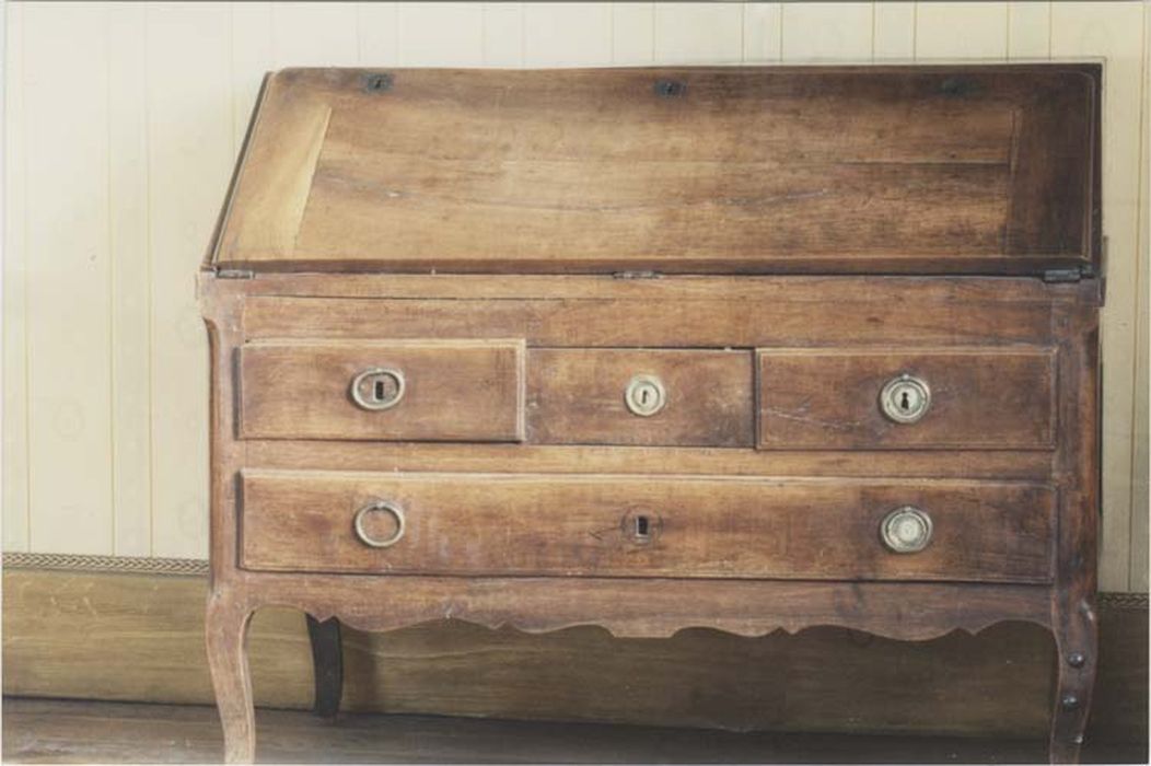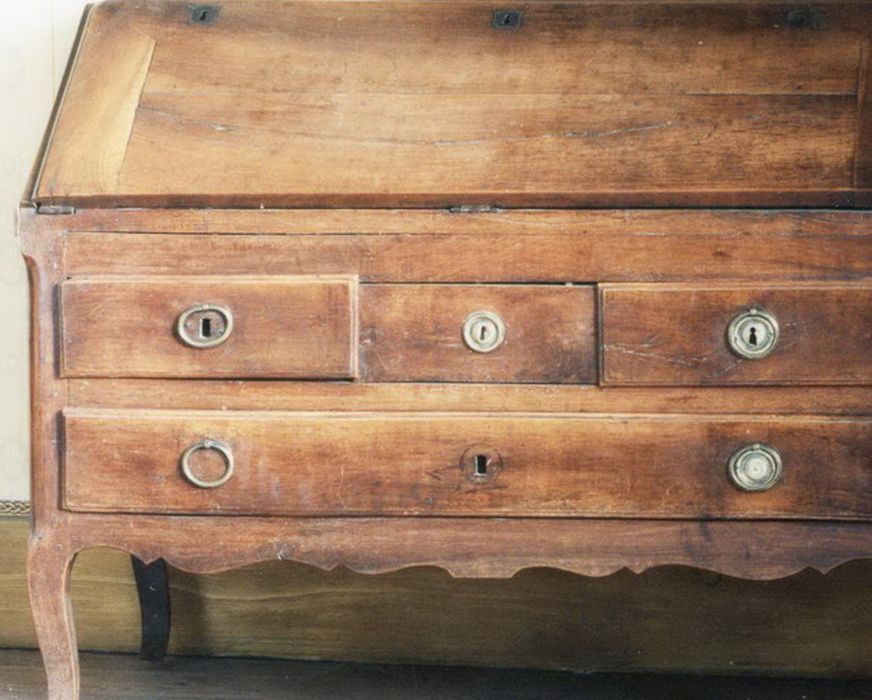 En façade au dessus d'un grand tiroir, deux petits tiroirs encadrant un faux tiroir à secret. L'abattant ouvert découvre une série d'étagères.Il n'y a pas de décor marquetté comme les autres secrétaires de cette salle.