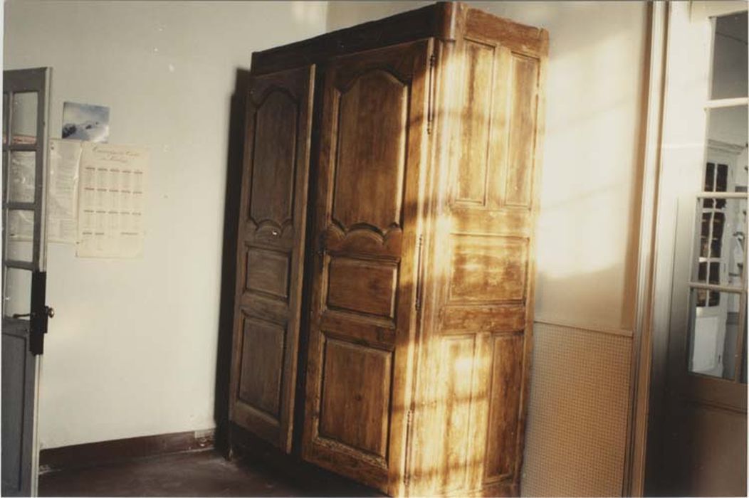 Armoire composée de panneaux rectangulaires et de deux panneaux travaillés. La corniche a disparu.