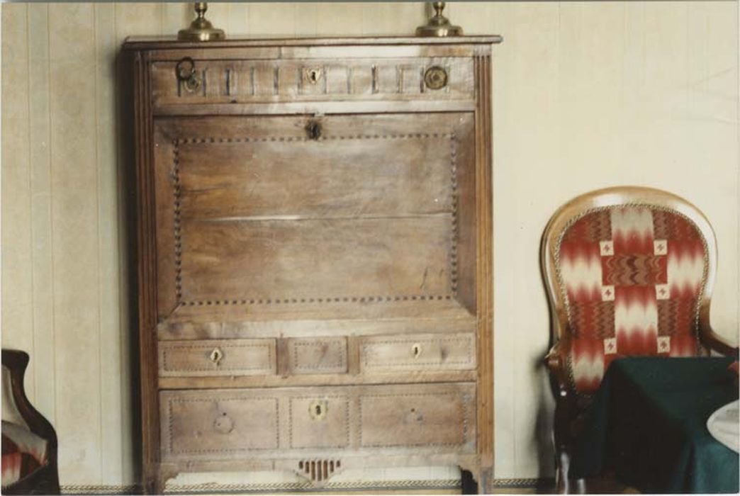 Un tiroir se trouve au dessus de l'abattant et deux petits tiroirs encadrent un tiroir à secret se trouvent en dessous de l'abattant ainsi q'un grand tiroir. Le décor et les filets sont en citronnoer brûlé.En s'ouvrant l'abattant libère de petites étagères installées à l'intérieur.