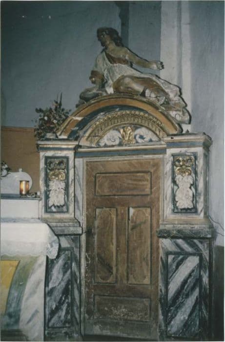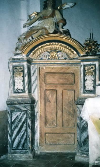 Le milieu du retable n'existe plus. Il ne reste que les côtés servant de porte à la sacristie surmontées de statues d'anges étendus.