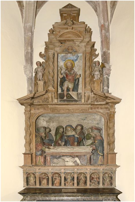 Groupe sculpté en pierre peinte de la 1ère moitié du 16e siècle, à huit personnages, dans un encadrement comportant colonnes torses cannelées et fronton brisé. retable autour en bois sculpté et peint du 17e siècle, avec sept niches aux frontons en coquilles avec statues.