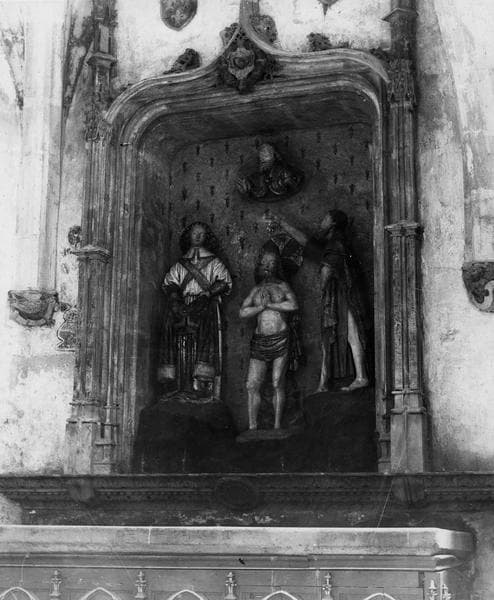 Groupe de trois statues dans une niche gothique.