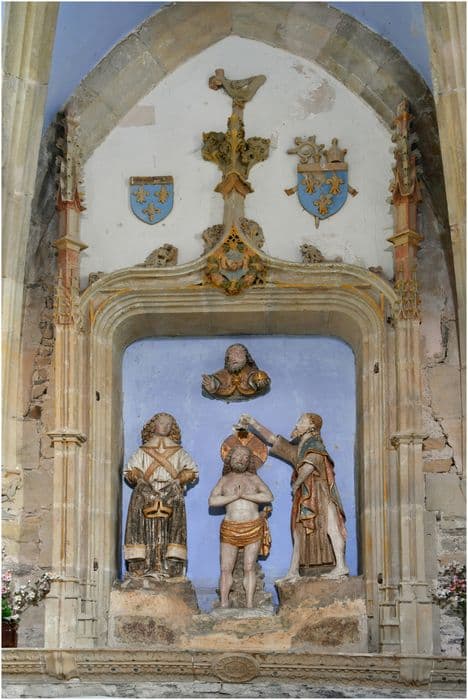 Dans une niche gothique, au-dessus de l'autel, niche fermée par un arc en accolade et cantonné de deux pinacles. Au centre le Christ nu, les reins ceints d'un lige, à sa gauche saint Jean-Baptiste élève la main droite pour verser l'eau baptismale, à la droite un ange tient la tunique du Christ. Au-dessus du Christ, le buste du Père éternel sort du fond de la niche. Dans l'arc en en accolade au milieu d'une couronne les armes de Sainte Foy.