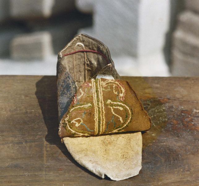 Pied gauche, en cuir autrefois verni et brodé de crème, de bleu, de rose et de vert au point de tige et de chaînette, chèvre doublée de basane. Elle est faite d'une seule pièce dont les deux extrémités sont cousues au milieu de la face interne du pied.