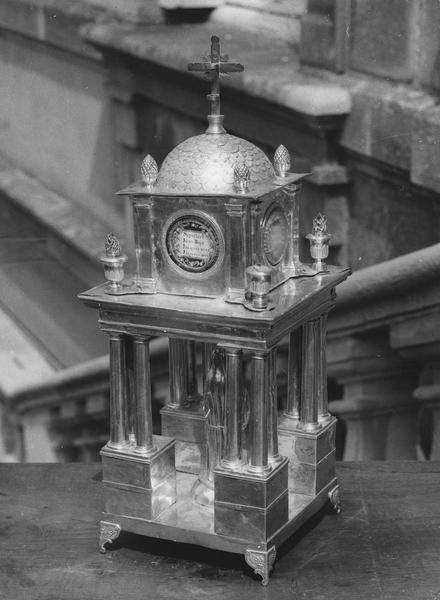 Plaques d'argent cloutées sur âme de bois. Edifice rappelant un temple antique, abritant une petite statue de la Vierge. Celle-ci, debout, est placée au milieu de la base entourée de quatre socles cubiques, supportant chacun trois colonnes. Le plateau carré qui repose sur les colonnes supporte à son tour le reliquaire. Celui-ci, de forme cubique, porte une toiture en coupole couverte d'ardoises arrondies. Chaque face du reliquaire est percée d'un fenêtre ronde, encastrée de deux pilastres.