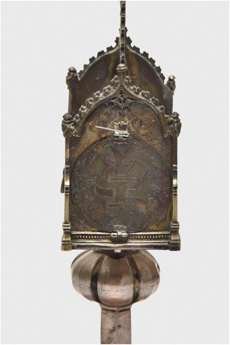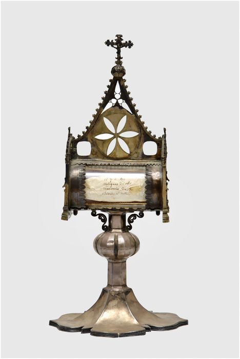 Reliquaire pédiculé à cylindre de verre horizontal, pied à quatre lobes, tige hexagonale, noeud à côtes, cylindre maintenu par deux plaques encadrées de contreforts à pinacles surmontées d'un arc en accolade, porte à charnières. Au-dessus du cylindre, gâble ajouré, percé d'une lune pour exposition du saint sacrement, remplacée par une rosace de métal à une époque postérieure. Boule et croix au sommet.