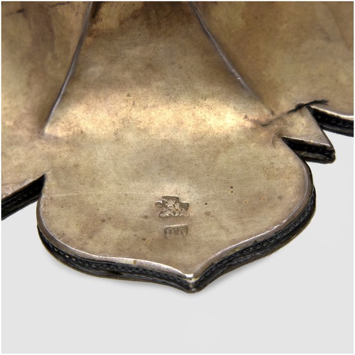 Poinçon de maître : g a (pied et plaques latérales). Poinçon de ville : poinçon de la ville de Rodez au 15e siècle (pied et plaques latérales).