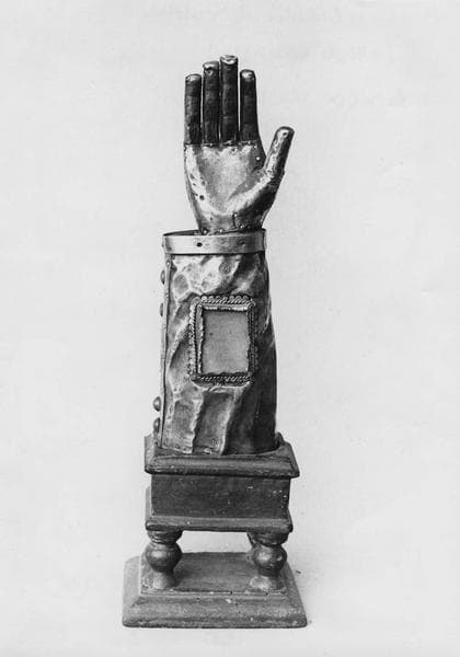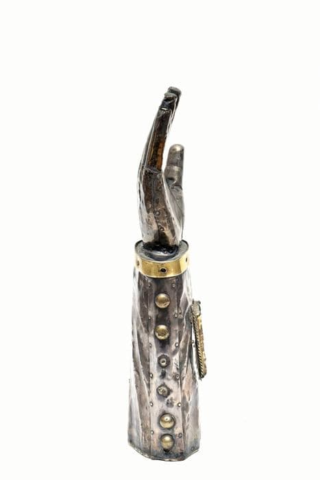 Bras reliquaire formé de plaques d'argent clouées sur âme de bois. Main droite ouverte. Ouverture rectangulaire pour les reliques placée du côté de la paume, fermé par une plaque de verre. Support de bois largement supérieur.