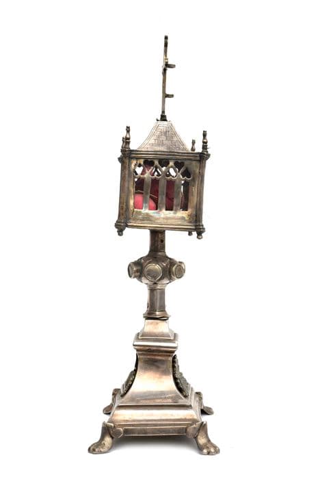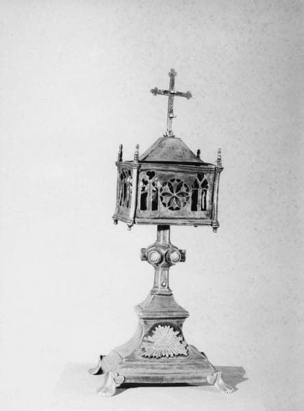Reliquaire pédiculé, formé d'une boîte rectangulaire couverte d'une toiture à quatre pentes, sommé d'une croix lisse aux extrémités ornées. Les quatre côtés sont ajourés en forme de vitraux et rosaces et les angles sont renforcés de contreforts à pinacles. Tige hexagonale, noeud hexagonal portant six caissons circulaires lisses. Pied du 19e siècle.