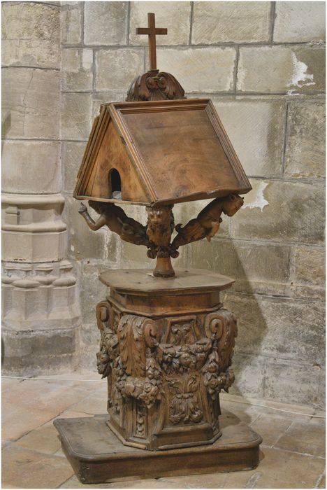 Pied quadrangulaire. Sur les quatre plus larges côtés de cet octogone, on trouve des cartouches moulurés, décorés de compositions végétales et sur les quatre angles de forts volutes composés de feuille d'acanthe et guirlandes de fruits. Le lutrin articulé est supporté par les quatre évangélistes et surmonté d'une croix reposant sur une coquille Saint Jacques entourée de feuilles d'acanthe.