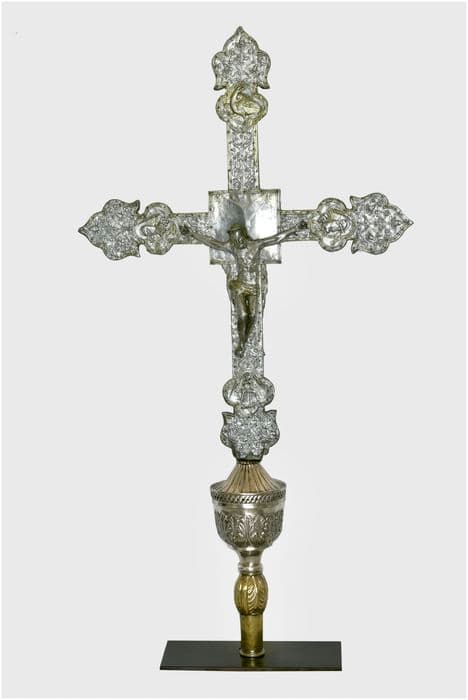 Croix en argent repoussé sur âme de bois.