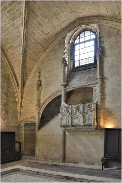 Sous une arcade pratiquée dans le mur, un escalier mène à cette chaire de lecteur.