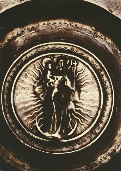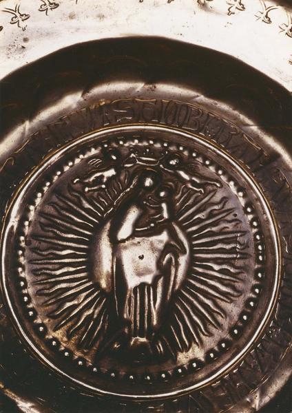 Vierge à l'Enfant entourée de rayons, debout sur le croissant de lune, au fond du premier plat. Vierge à l'Enfant couronnée par deux anges, au fond du deuxième plat.