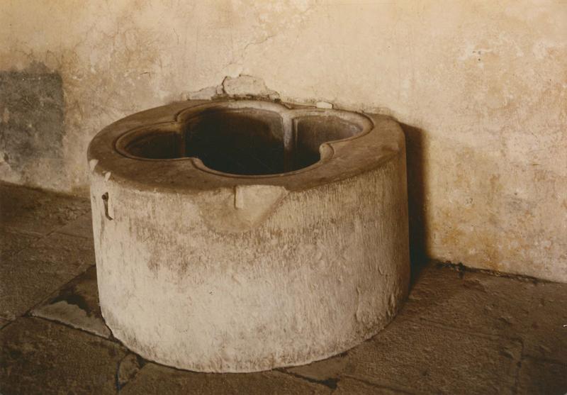 Cylindre de pierre lisse à l'extérieur, creusé en quadrilobe à l'intérieur. Traces des attaches du couvercle. Une partie est engagée dans la muraille.