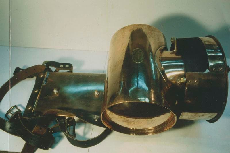 Appareil-plongeur en cuivre (étamé à l'intérieur) et laiton. Appareil en cuivre, serti et soudé, composé d'un réservoir à air comprimé cylindrique horizontal, solidaire, par l'intermédiaire d'une soupape régulatrice d'air, d'une chambre de mise à la pression ambiante, ayant la forme d'un cylindre vertical.