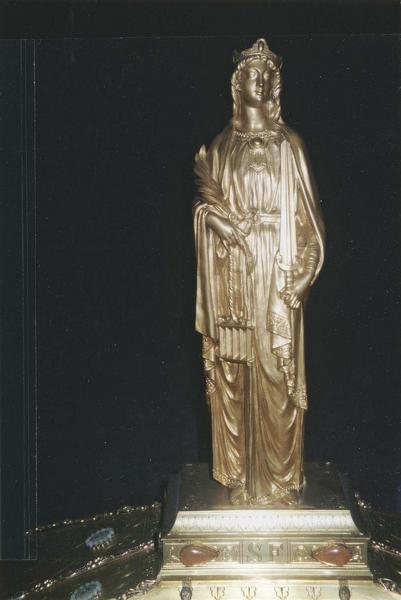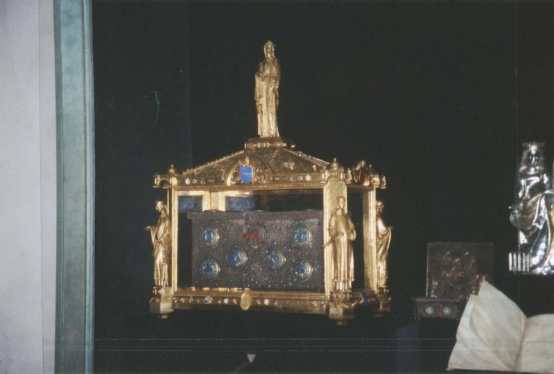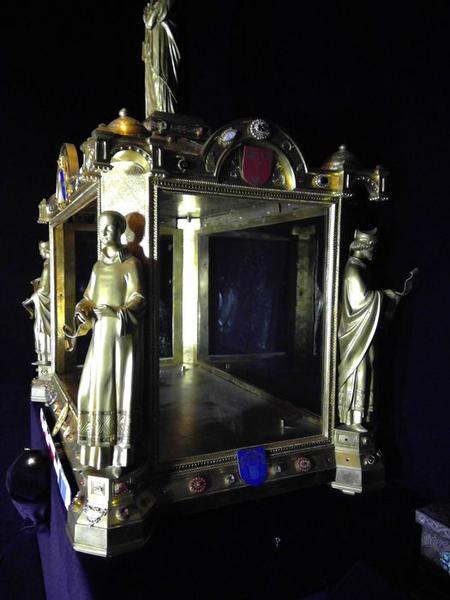 Arrêté : Châsse du coffre de l'abbé Boniface, portant aux quatres angles les statuettes de l'abbé Etienne, Saint-Dulcide, l'abbé Odolric et Mgr. Bourret, évêque d'Agen, commanditaire du reliquaire, et au sommet, une statuette de Sainte-Foy, par P. Poussielgue-Rusand, bronze doré, 1878 (dans une vitrine du trésor).
