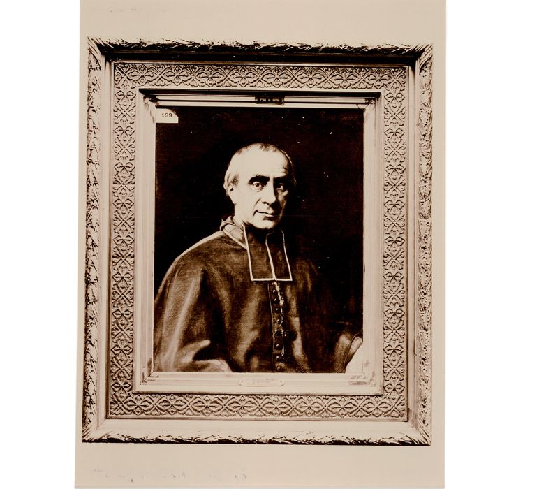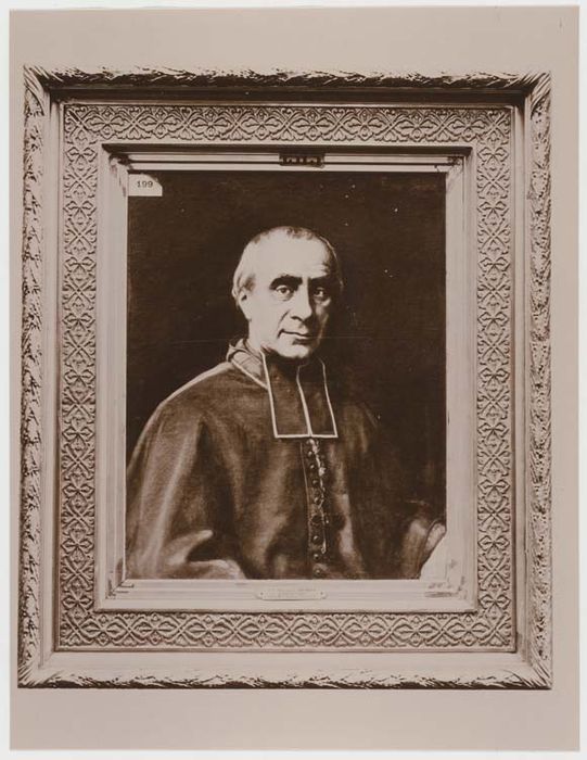 Joseph-Ernest Bourret fut évêque de Rodez et de Vabres entre 1871 et 1897. Il devint cardinal en 1893. Il s'agit peut-être de l'oeuvre mentionnée dans l'inventaire de 1906, au n°120, un portrait en pied de l'évêque Bourret dans le grand salon. Au moment de la loi de séparation de l'Eglise et de l'Etat en 1905, cette oeuvre est soustraite à la procédure d'aliénation, au titre de son intérêt historique et artistique, pour devenir la propriété de l'Etat.