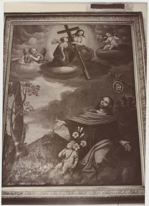 saint Joseph : prière ; Christ : La Croix ; Vierge ; ange : crâne, rameau, fléau ; écu ; fond de paysage : ville, château