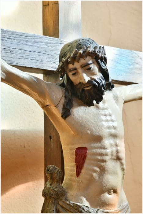 Christ en croix présentant une plaie au côté droit.