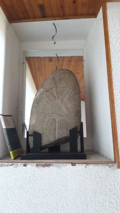 Statue-menhir aménagée dans une petite dalle plate, entièrement piquetée, ovale, au sommet régulièrement façonné. 3 états sont perceptibles. Du premier état ne subsistent que 2 jambes. Pour le second état, la statue est retournée et représente un personnage masculin au visage bien identifiable, en relief. Les yeux sont formés par des cupules, le nez est bien délimité. Ce personnage présente 2 bras droits obliques, des doigts figurés et 2 jambes jointives. Il est doté d'une ceinture à boucle et porte un baudrier à boucle et un fourreau. Les plis d'un vêtement sont visibles sous le bras gauche. Dans le dos, le baudrier se rattache à la ceinture. Dans un troisième temps, la sculpture est féminisée : après une préparation par piquetage, un collier à pendeloque en Y est sculpté entre les 2 mains et 2 seins sont figurés de part et d'autre du visage.