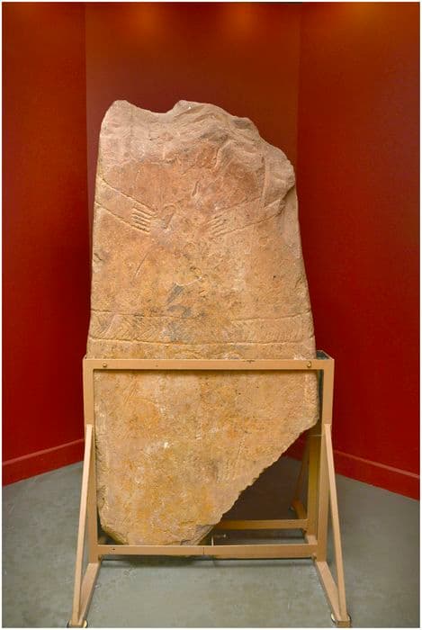 Statue-menhir masculine finement gravée amputée de la partie sommitale et de la partie basale gauche. Le personnage présente des bras obliques prolongés par des mains aux doigts individualisés, 2 jambes jointives avec un bel arrondi des genoux et des pieds. Il porte une ceinture à chevrons et est équipé d'un fourreau à anneau et d'un baudrier uniquement visible dans le dos, entre les 2 omoplates.