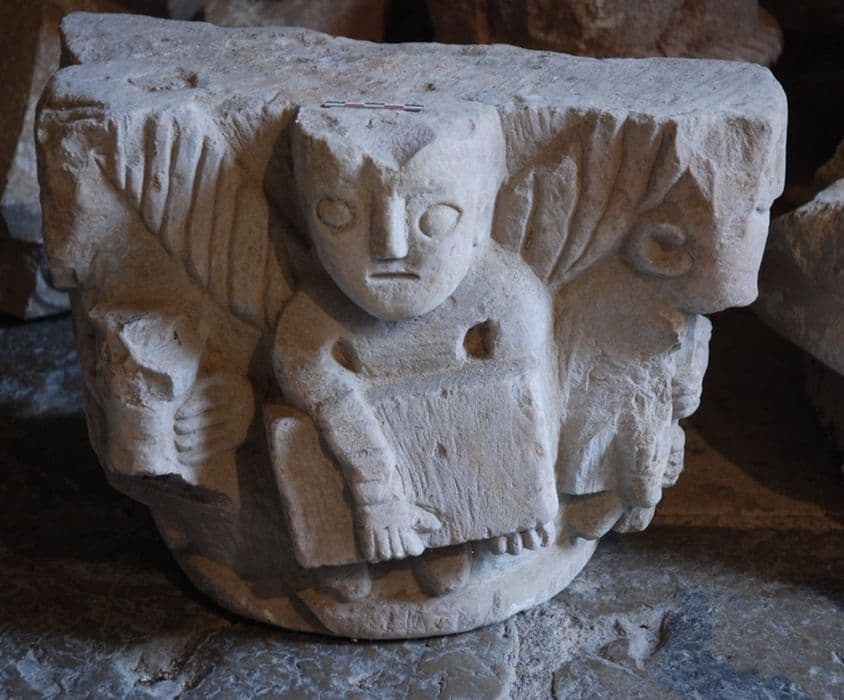 Ce chapiteau de facture très naïve représente un ange ailé tenant un livre ouvert, encadré de deux personnages. Celui se trouvant à sa droite tient dans une main un outil emmanché et dans l’autre ce qui pourrait correspondre à une enclume, le second personnage côté senestre, s’enfonce la lame d’une épée sous le menton, sa bouche aux lèvres proéminentes curieusement resserrée au centre, évoque la douleur.