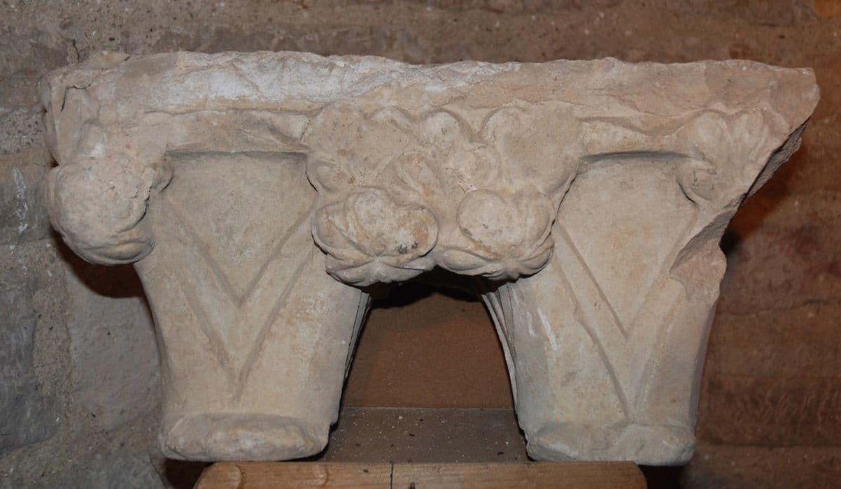 Ce chapiteau possède un astragale biseauté (à double chanfrein) sur lequel la corbeille de forme allongée est décorée de larges tiges qui partent de la base pour venir renforcer les angles des tailloirs en présentant des boules épanouies en fleuron. Une mince échine en forme de disque tient lieu d’abaque.