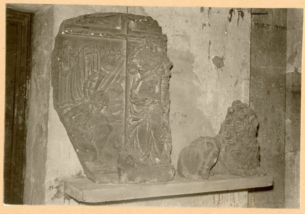 h = 90 ; la = 62 ; Dimensions du bas-relief ; lion : h = 46, la = 56 ; casque : h = 32