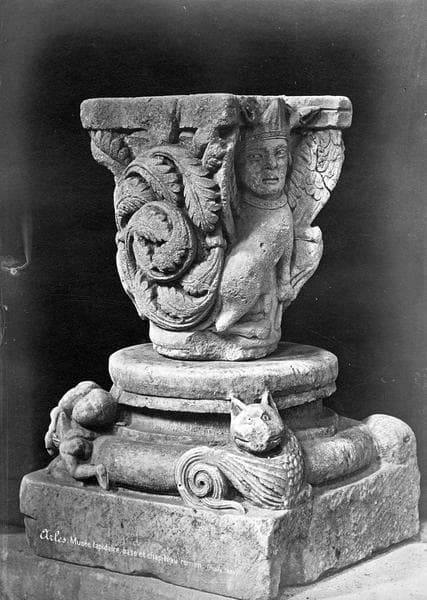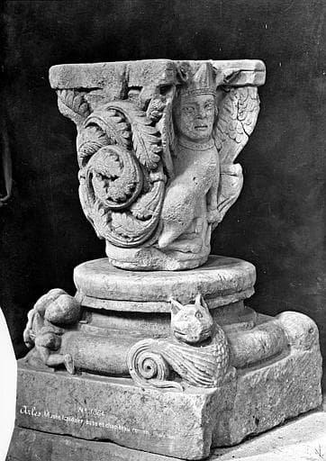 Chapiteau roman orné d'acanthes et de têtes d'hommes.