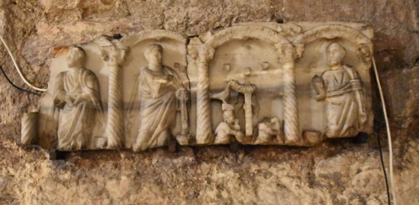 En marbre de Carrare. Fragment formé de deux morceaux accolés. Quatre compartiments sont délimités par des colonnes torses à chapiteaux dérivés du corinthine, portant des arcades. Dans la troisième niche à partir de la gauche, se trouve le symbole, très mutilé, de l'anastasis.
