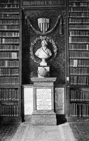 Porte l'inscription : A la mémoire de J.B. Marie Piquet marquis de Méjanes 1er consul d'Aix procureur du pays qui par son testament du XXVI mai MDCCLXXXVI a légué à la province de Provence cette précieuse bibliothèque pour être rendue publique dans la ville d'Aix à sa capitale.